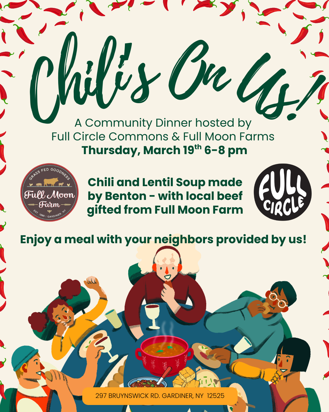 On the precipice of Spring’s re-emergence, together, let’s all share a delicious meal from the same pot. The Chili dinner is offered by Full Moon Farm and Full Circle Commons as a gift to our community. We will have a very short discussion with Paul Colucci and have plenty of time to commune with our neighbors, share stories of the winter and dreams of the seeds we are sowing for the coming seasons. This event is family-friendly, and open to all our neighbors. The chili is a gift from Full Moon Farm. Benton will do the cooking and Gardiner Bakehouse will offer some cornbread. In addition to enjoying the chili, we will be making loads of extra food to jar-up and share in the coming days with members of our surrounding community who might be hungry and appreciate a hot meal.