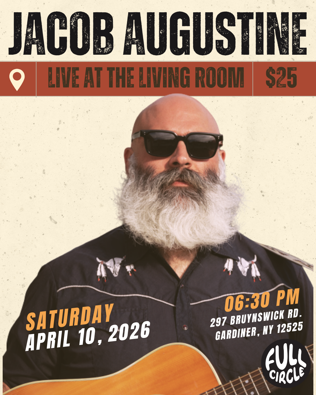 Experience an unforgettable evening of music with Jacob Augustine, performing live at The Living Room at Full Circle. A Maine-born, Philadelphia-based indie folk artist, Augustine has spent nearly two decades cultivating a devoted following across the Northeast and beyond. Known for his elusive presence and powerful returns, he moves fluidly between expansive, full-band arrangements and intimate, stripped-down performances—always anchored by his unmistakable voice.