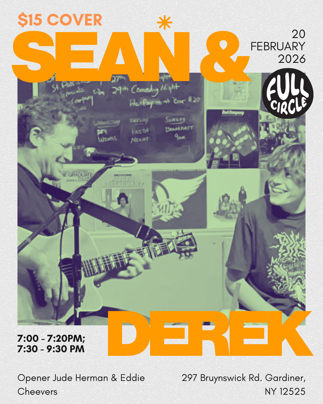 Join us at The Living Room at Full Circle for an intimate evening of live music and great company. The night begins with an opening set by Jude Herman & Eddie Cheevers from 7:00–7:20 pm, followed by a full evening of guitar-driven performances from Sean and Derek Schenker from 7:30–9:30 pm. Arrive early and enjoy a drink or a bite at Benton’s before the show, then settle in for a relaxed, immersive live music experience. 🎼✨